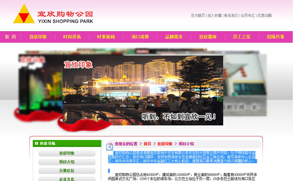 宜欣購物公園是由海南宜欣房地產(chǎn)開發(fā)有限公司開發(fā)的大型商業(yè)房產(chǎn)項目。位于明珠路與金龍路的交匯點,地處??趪Q(mào)、世貿(mào)和西海岸生態(tài)走廊高檔社區(qū)金三角區(qū)域,扼守海岸中心生活區(qū)、城市中央商務(wù)區(qū)、城市中央金融區(qū)三大核心樞紐,雄踞??谧罹呦M潛力新興商圈的核心。