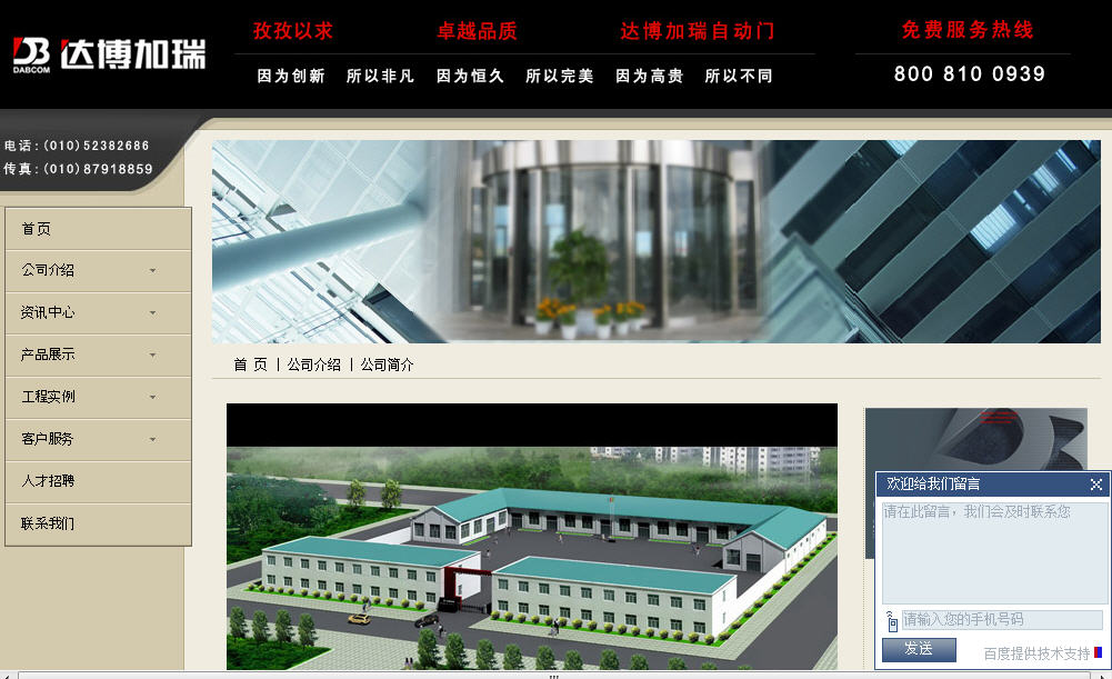 公司始創(chuàng)于1993年3月,前稱為“北京瑞康自動門公司”,在整合著名自動門公司及專業(yè)建筑自動化產(chǎn)品后,由北京有色金屬總公司與加拿大加瑞國際工程公司共同出資,在中國北京注冊了高新技術(shù)中外合資企業(yè)—北京達博加瑞建筑自動化系統(tǒng)有限公司,專業(yè)從事自動門、自動旋轉(zhuǎn)門、智能門禁系統(tǒng)的生產(chǎn)制造及技術(shù)開發(fā)。